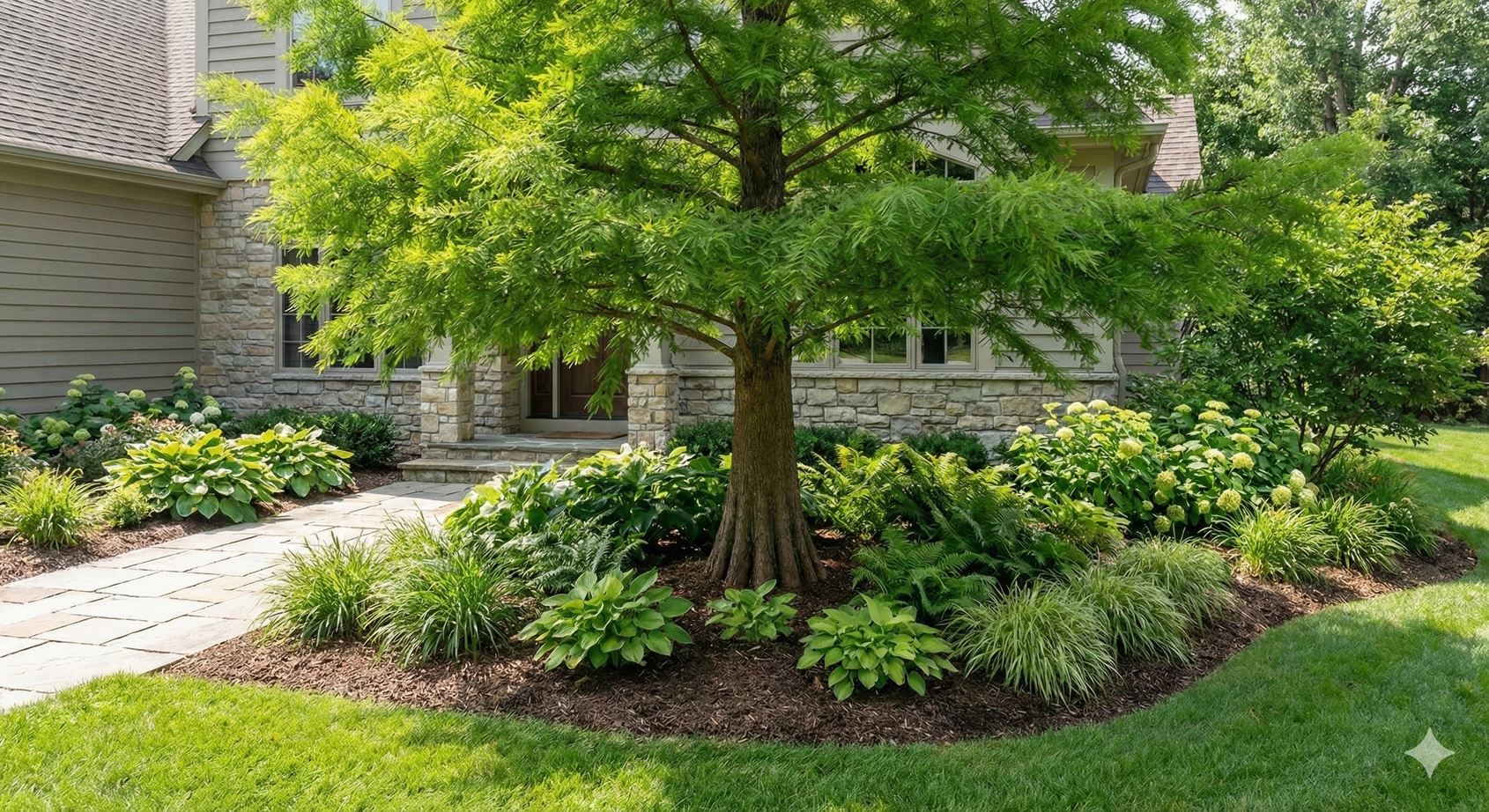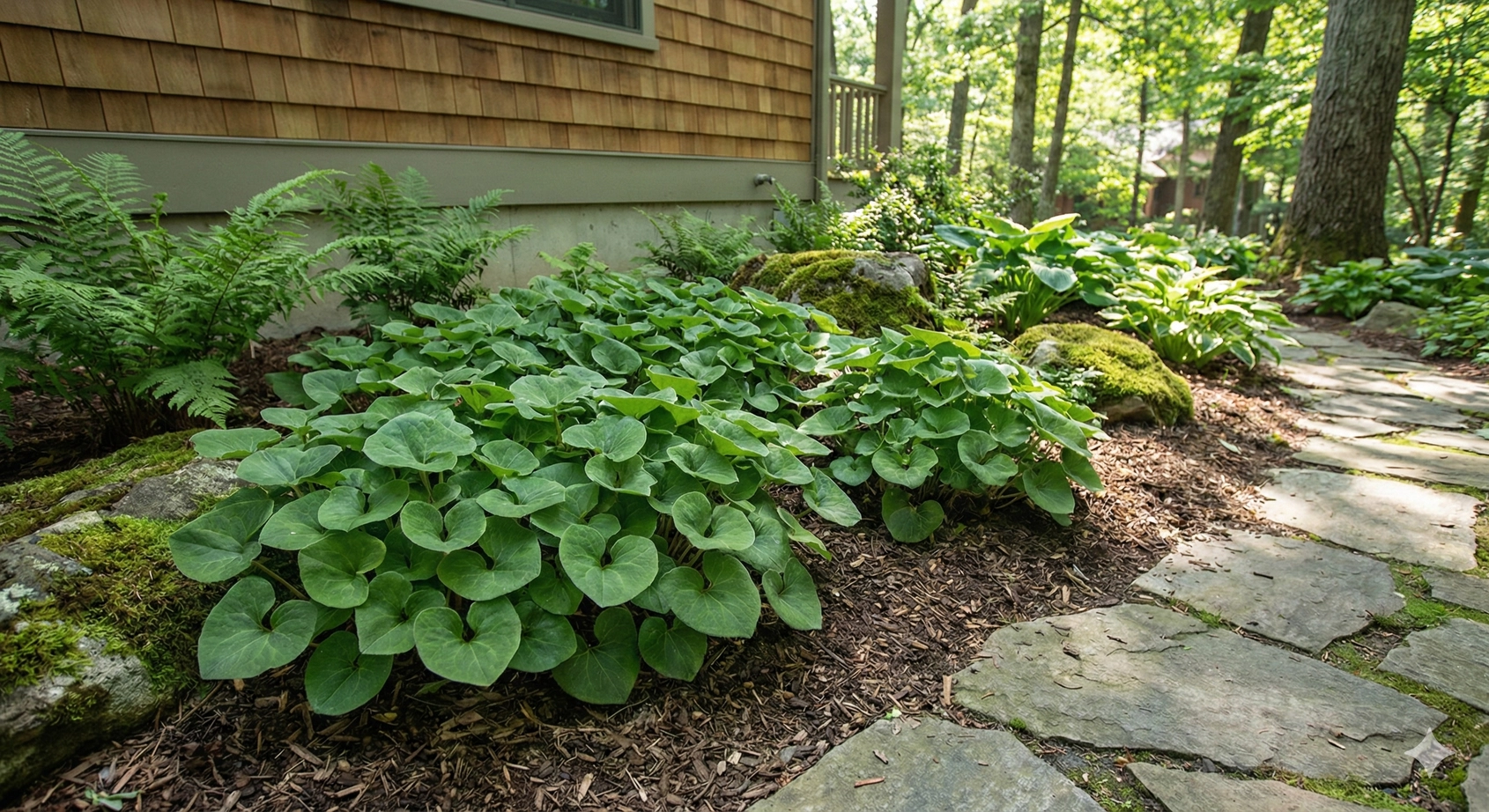 The most challenging Madison County landscape condition: dense shade under mature trees where lawn grass fails and sun-loving plants struggle. Wild Ginger, Spicebush, and Oakleaf Hydrangea create layered plantings in conditions that defeat most alternatives.